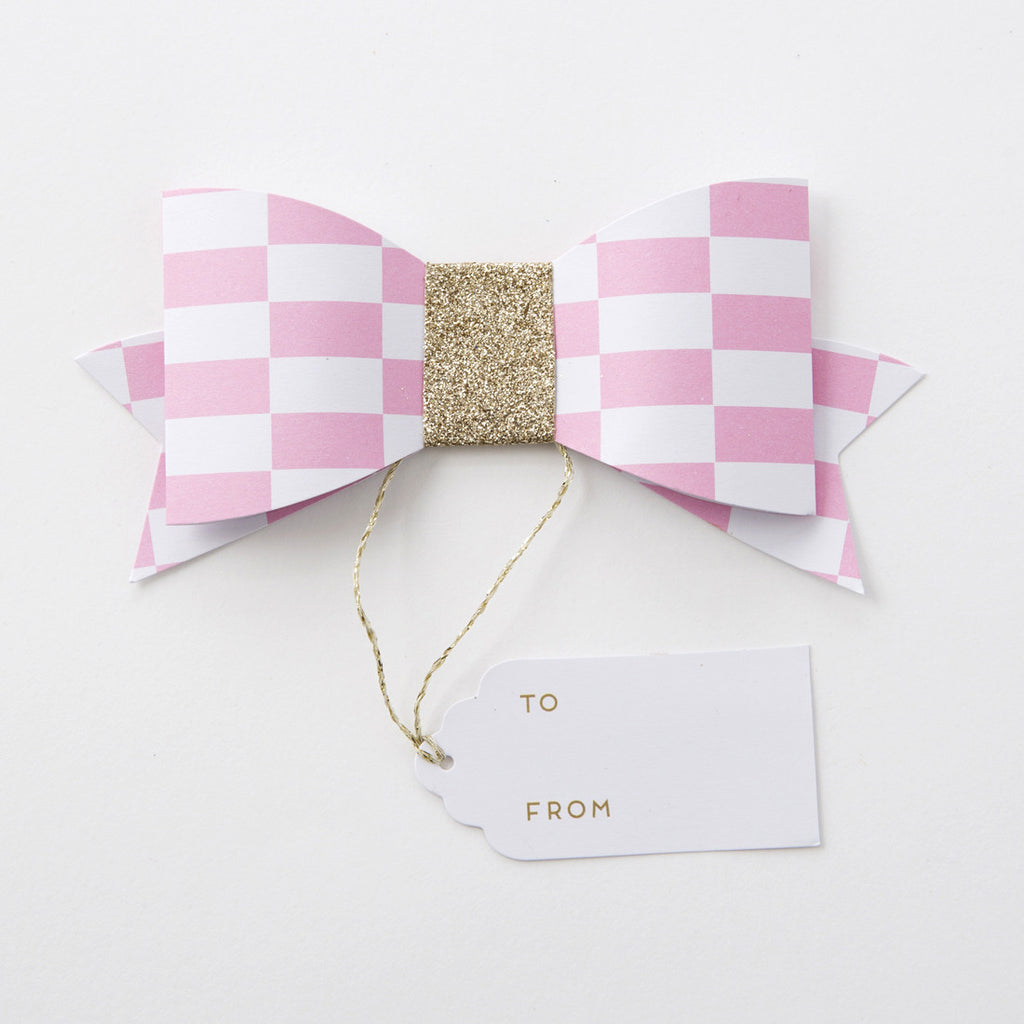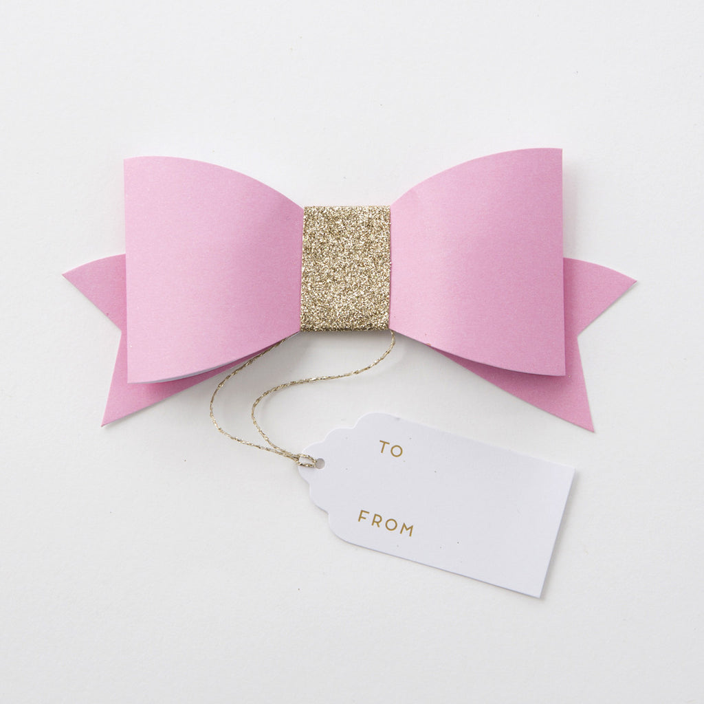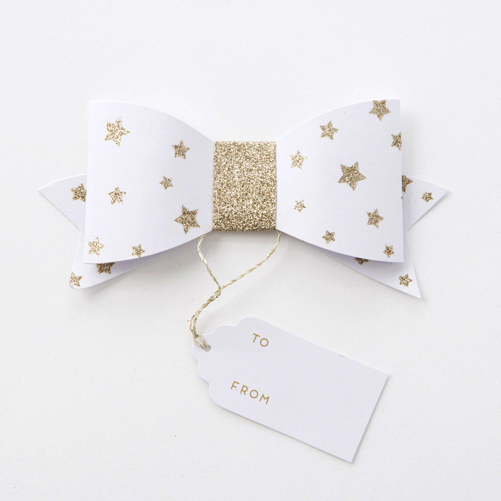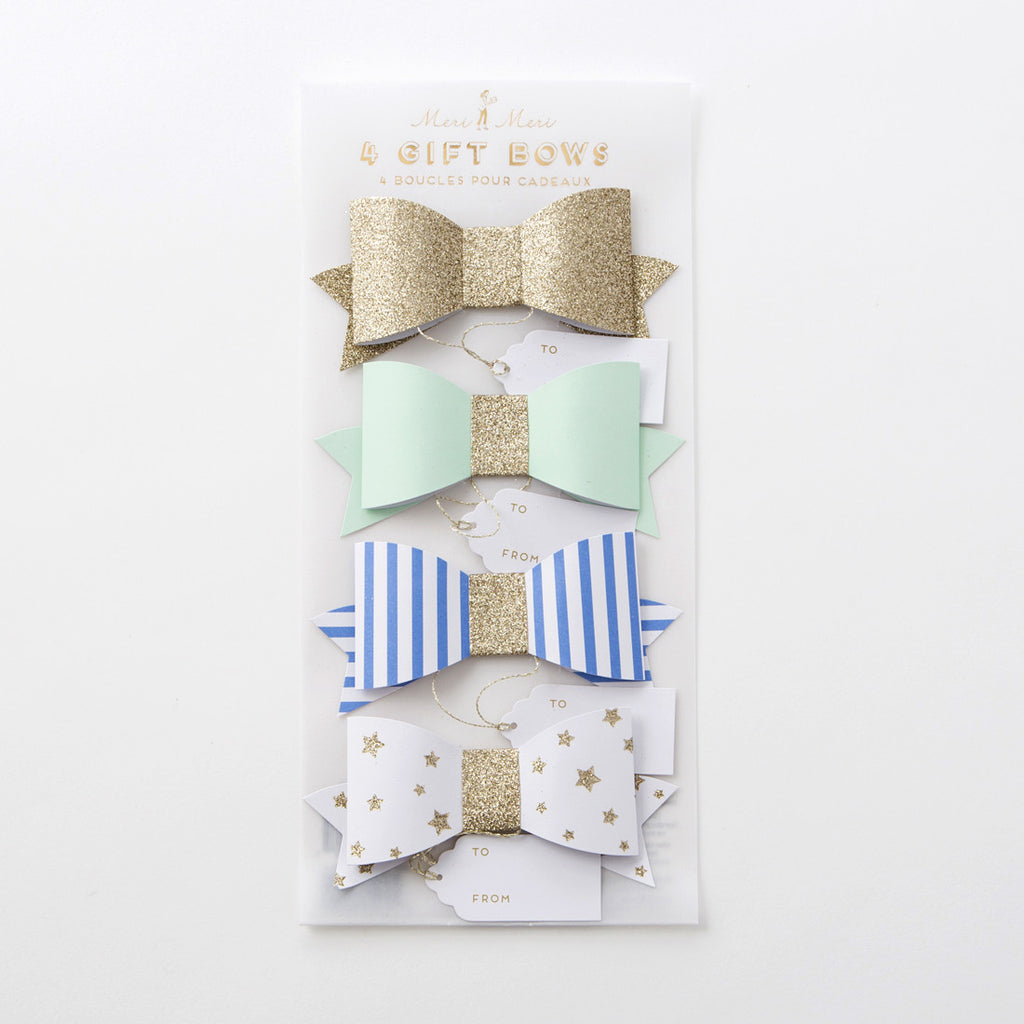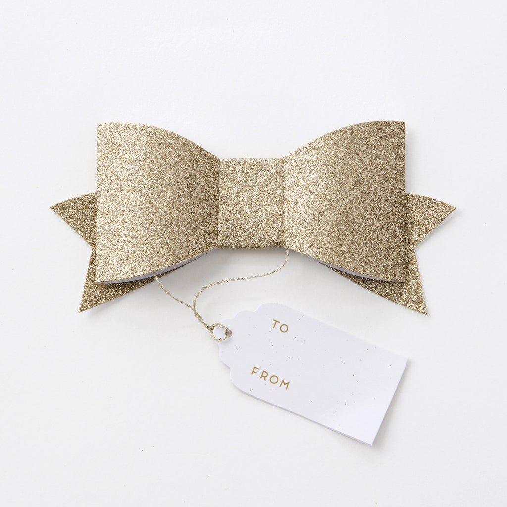 Add the finishing touches to that special gift with these decorative bows. Beautifully patterned and finished with gold glitter the bows come with their own tags.