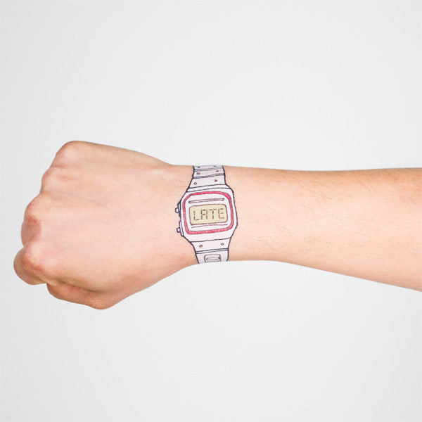 The Boardwalk Set includes a Beachball, Hot Dog, Lawn Chair, Popsicles, Soda, Sunglasses, Swim Fins, and You're Late(Blue) AND free single tattoo sponge! Includes 8 tattoos and comes packaged in a card stock sleeve with a full-color photo on the front. These temporary tattoos are safe and non-toxic, lasting on average 2-4 days. We suggest placing on oil-free areas where skin does not stretch and keep them clean!