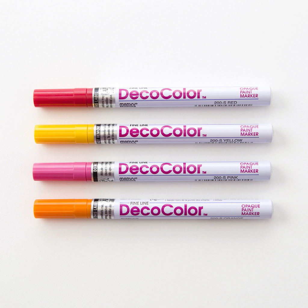 Uchida DecoColor Markers are opaque markers with exclusive pure pigment brilliance. Lightfast and weatherproof, DecoColor markers will permanently decorate and cover most surfaces, including: paper, wood, glass, mirrors, porcelain, plastic, clay, stone, metal, leather and cloth. Ask anyone at the Brit + Co. office what their favorite DIY tool is, and our guess is they will say the paint pen. Who doesn't love to doodle on everything with these colorful pens? Which is why our DIY team has put together 2 color sets that they use all the time! Brit + Co approved!