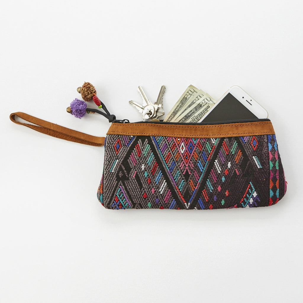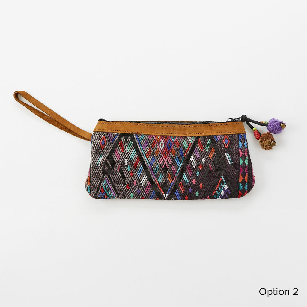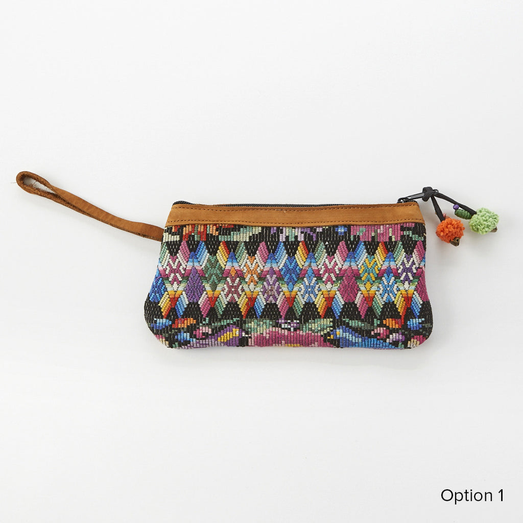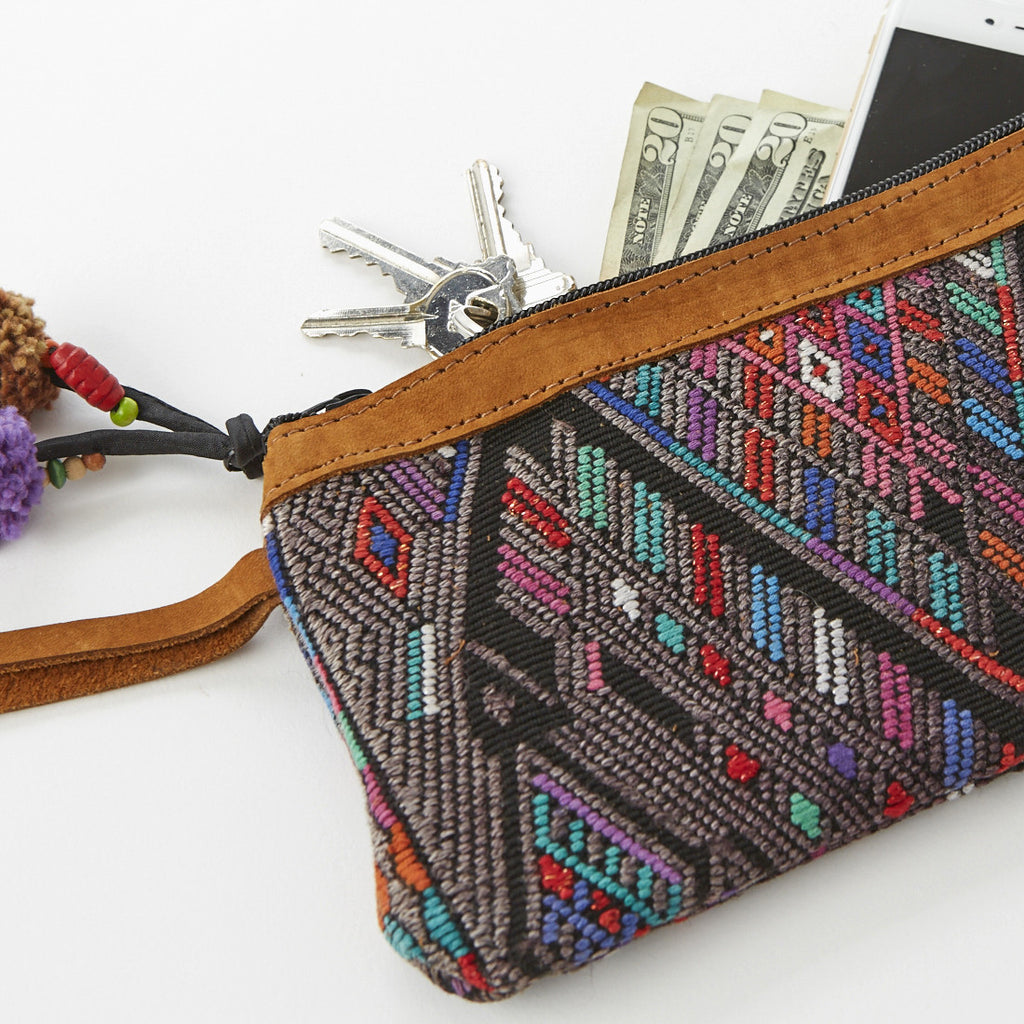 This wristlet is handcrafted from Huipil fabric from Guatemala. Convenient size at 10" in length and 5" in width. Each Gloria wristlet trimmed with soft leather with a 5" strap. Fully lined with a zipper closure. The zipper has an attractive pom pom decoration.