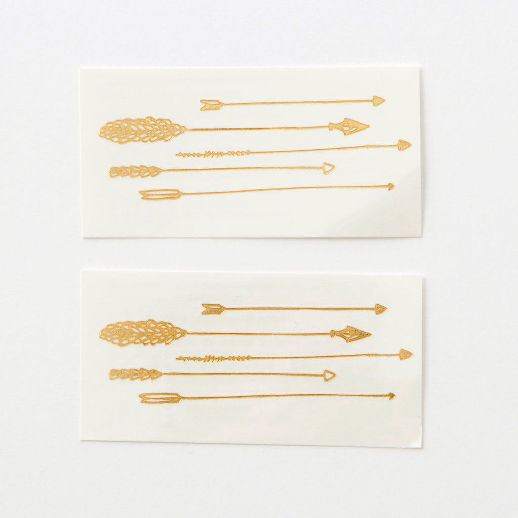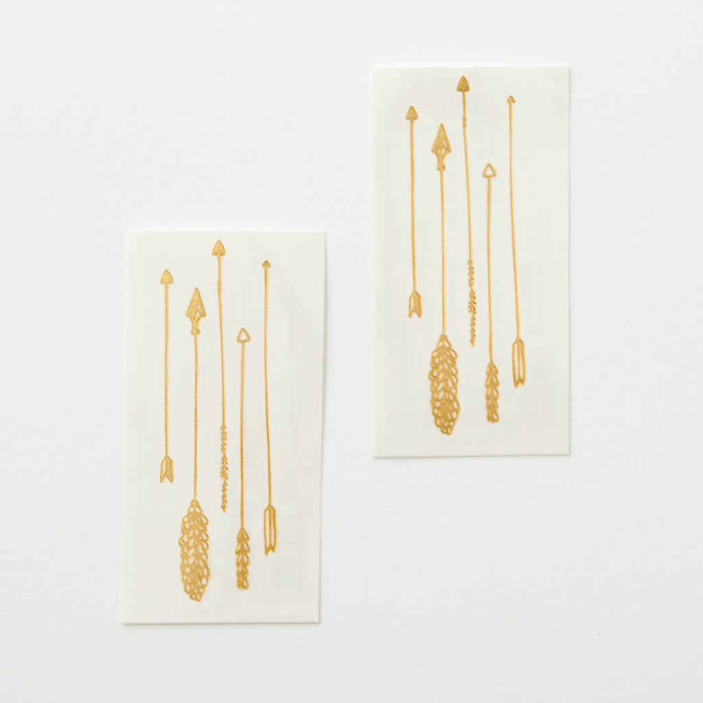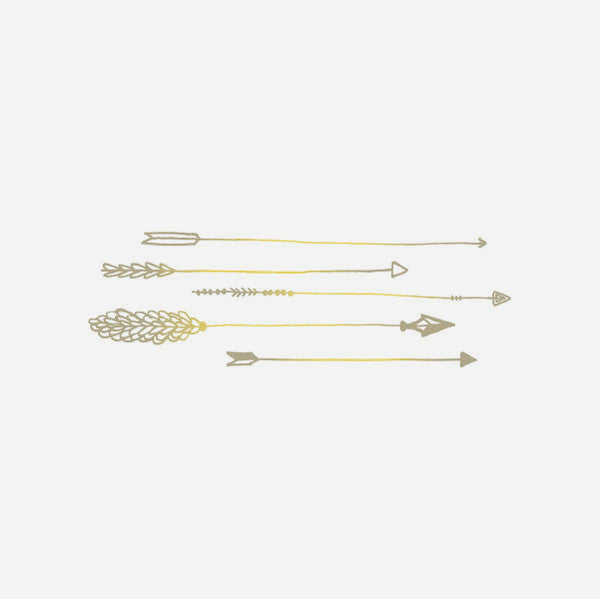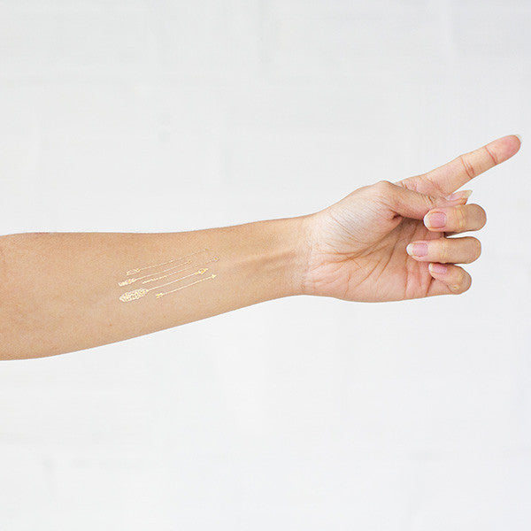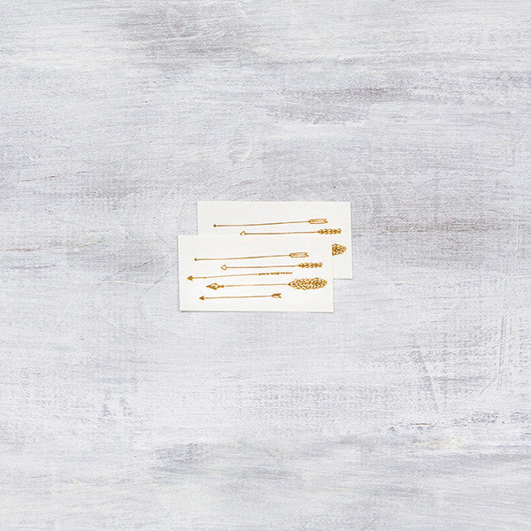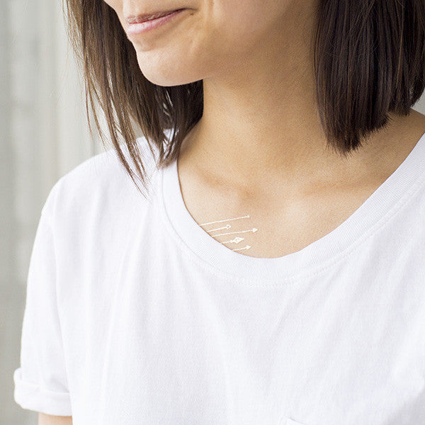 Add some delicate accents to your outfit by wearing these Arrows by Wesley Stuckey. They look great together but hold their own by themselves. These temporary tattoos are safe and non-toxic, lasting on average 2-4 days. We suggest placing on oil-free areas where skin does not stretch and keep them clean!