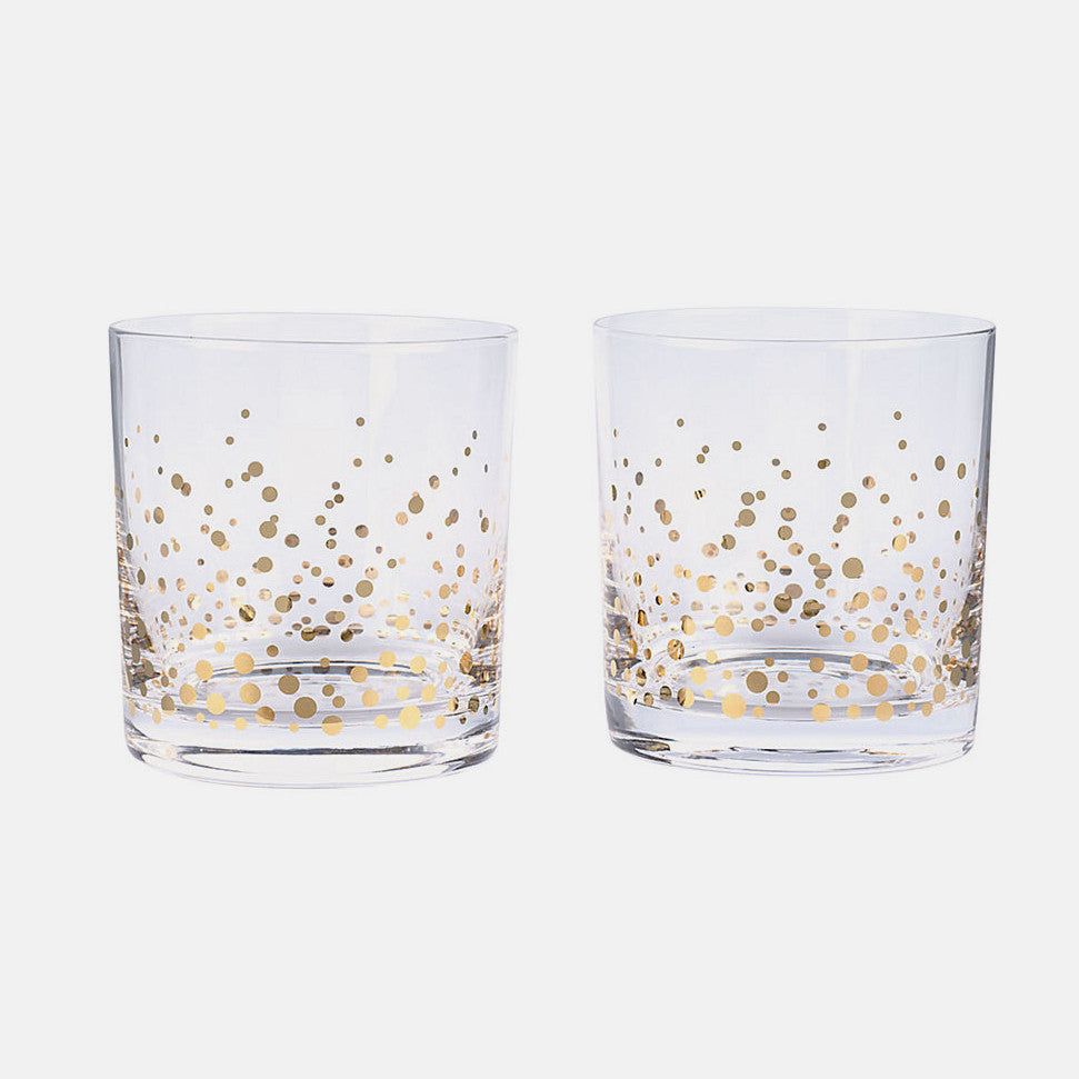 Make any occasion special with these clear glass tumblers with shiny gold confetti. Wonderfully festive and durable, this very popular design is essential for anyone planning (or attending!) a party.