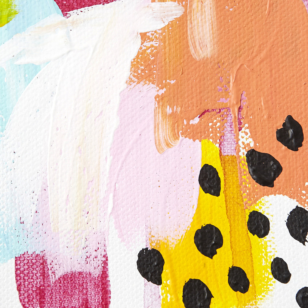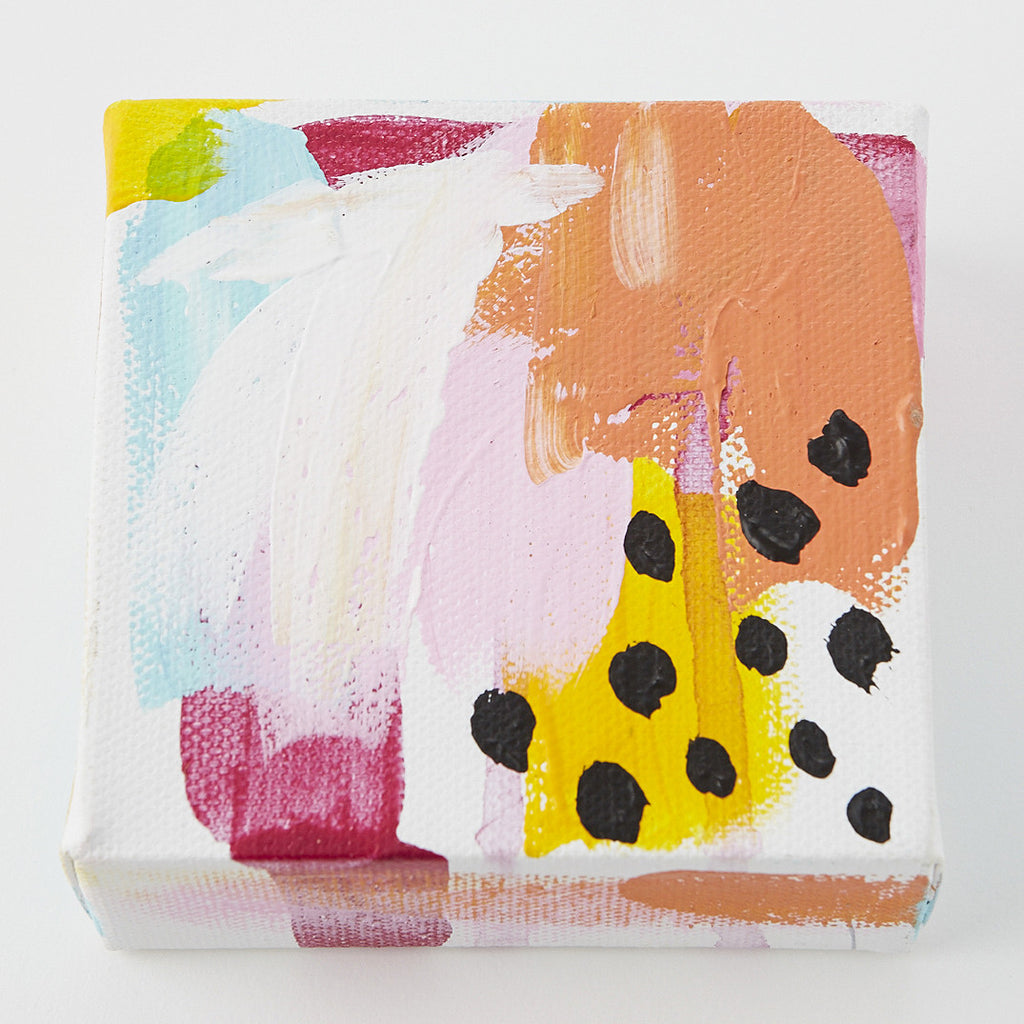 Colorful layered abstractions with mark making, using gouache, acrylics and oil pastels on a mini square canvas.