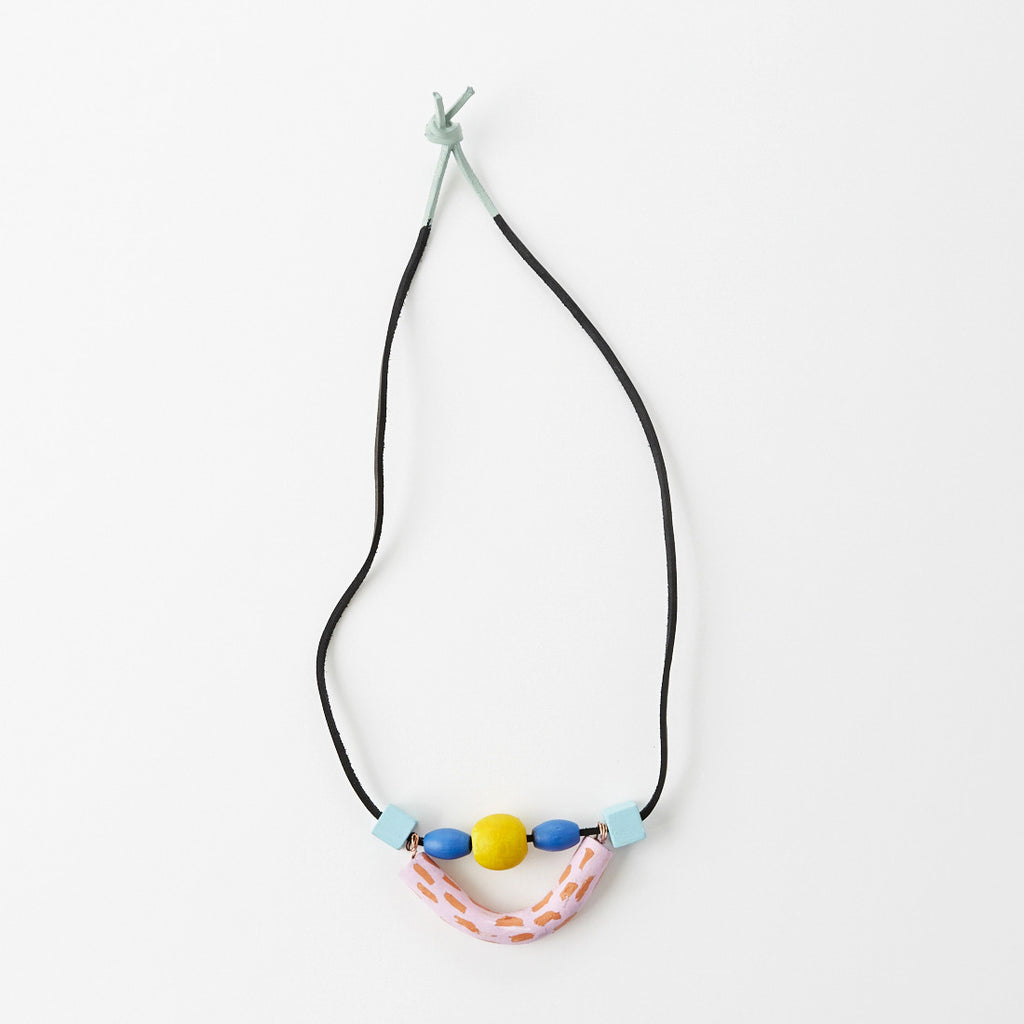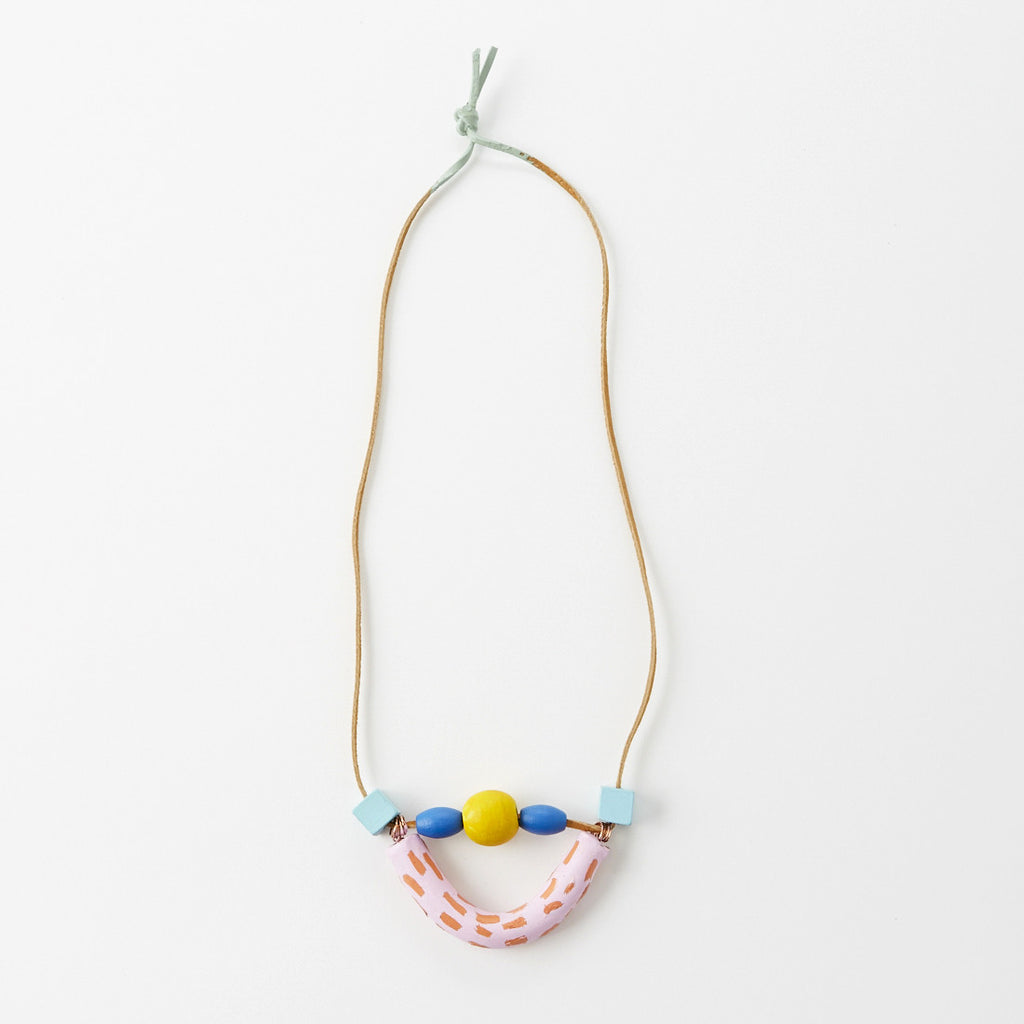 Hand painted wooden and handmade clay beads with 18" leather strap with color + brass accents.