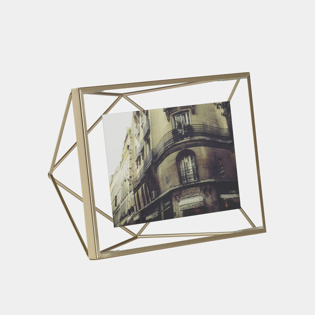 Add new dimension to your photo displays with this prismatic, 4x6" brass wire frame, in which a photo floats between two panes of glass. Can alternately sit on the desk or be hung on the wall.