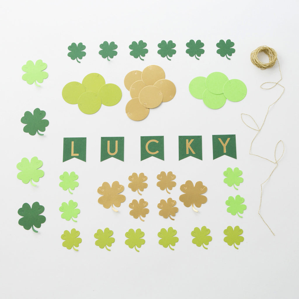 A garland full of Irish charm to decorate a St Patrick's Day celebration, with the word Lucky spelled out in individual letter pennants, and with a variety of four-leaf clovers and colored discs. Pennants are embellished with gold foil.